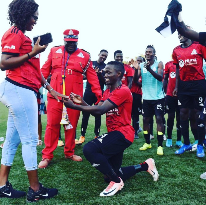Uyu Mucureezi yatunguye umukunzi we witwa Esther Swabale,amusaba ko yamubera umugore nyuma y’aho yari yaje kumushyigikira mu mukino wa shampiyona ya Uganda ikipe ye ya Vipers yanyagiraga Maroons ibitego 5-0 ku kibuga cya St Mary’s Kitende.