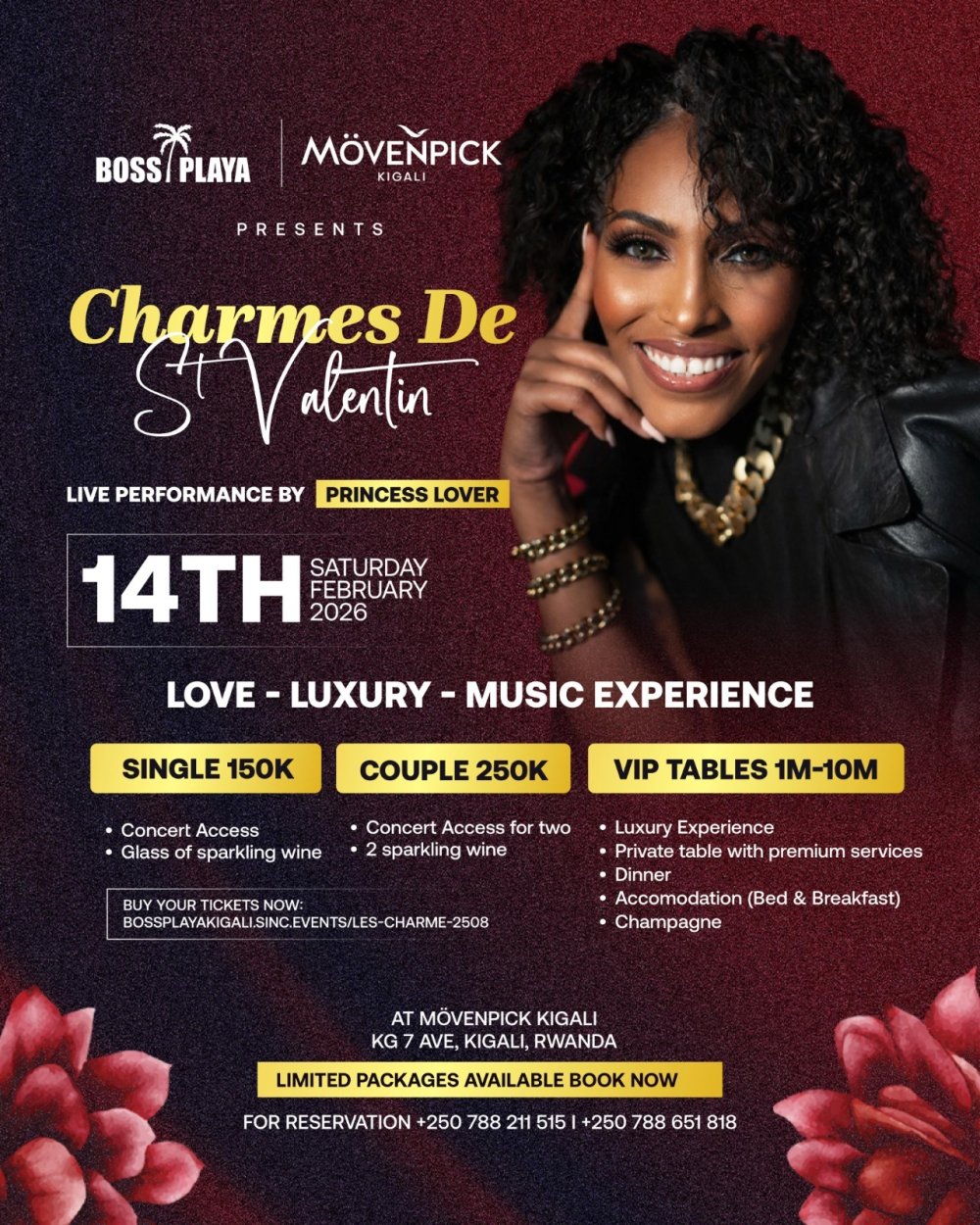 Kwinjira mu gitaramo cy’uyu muhanzi uzwi kuri album zirimo ‘Juste Moi Part 1’ yasohoye mu 2003 na ‘Tous mes rêves’ yasohoye mu 2007 bizaba ari ibihumbi 150Frw ku muntu umwe, ibihumbi 250Frw ku bakundana basohokanye abo bose bakazahabwa umuvinyo wo kunywa.